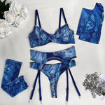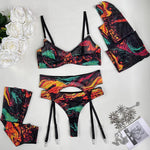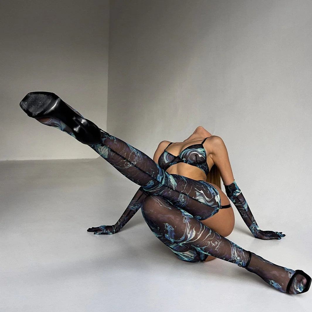 Introducing Carla's Tie Dye Set, a unique and sensual lingerie ensemble that combines tie-dye patterns with alluring details. This set includes a bra, thong, stocking, and elbow gloves, creating a complete and enticing outfit.