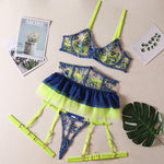 Introducing the Irina Ruffle Neon Set by Ellolace, a luxurious and tantalizing lingerie ensemble that combines ruffles, neon colors, and delicate lace. This 5-piece set includes a bra, underwear, garter belt, stocking and matching accessories, creating a complete and captivating outfit.